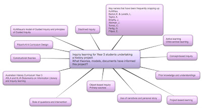 Finally, the mind map that I had developed (See blog entry for Thursday August 11) proved to be a valuable tool as I began to sort the information that I collected. The articles that supported the theories and concepts that I had identified as recurring and supportive of the ILA were put aside for further reading. As my case was strengthening with support information I was able to begin making connections between pieces of information that started out as separate points. For example, the use of artifacts, object-based inquiry and the use of concrete objects in historical inquiry evolved into one point concerning the importance of basing the ILA around the use of primary sources.